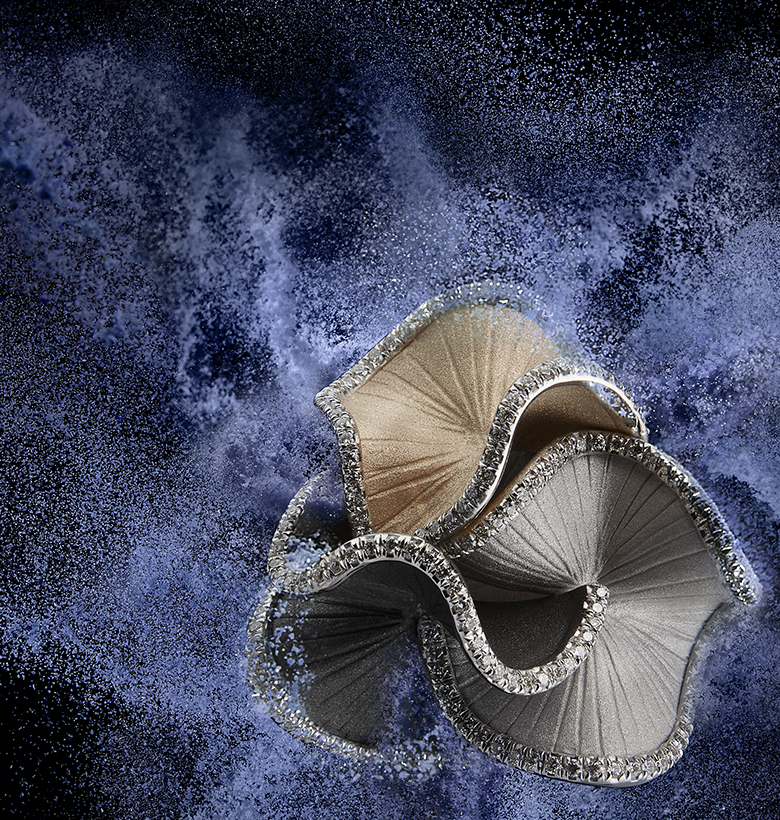 Dank des Gießprozesses kommen die Formen dieser modernen Schmuckskulpturen beim anschließenden Goldschmiede-Finish unkontaminiert an.