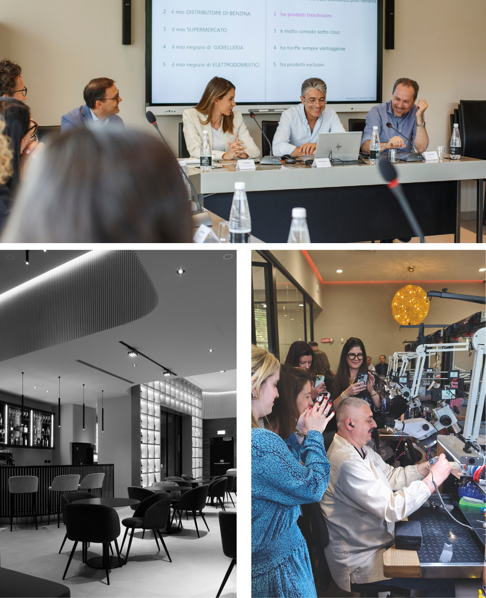 Cammilli Academy features dynamic spaces designed for various purposes, including sales practices, conference rooms, specialized areas with advanced screens, exhibition spaces, and a cozy restaurant with a wine-tasting area.