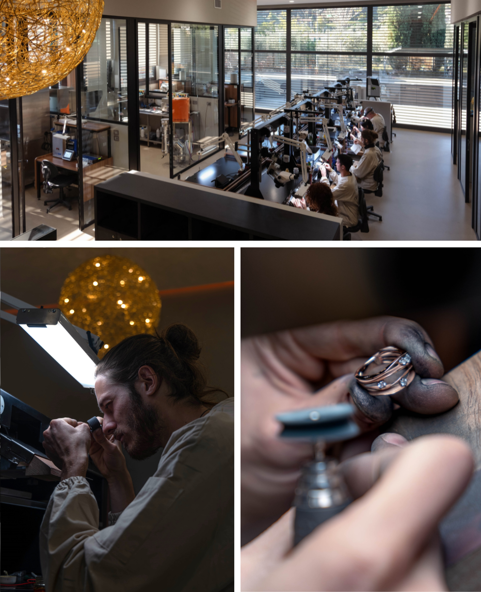 Opificium is truly a “tailor’s shop” for jewelry, dedicated to crafting the most exclusive, high-quality pieces. Equipped with cutting-edge machinery and custom-designed workbenches for goldsmiths and setters, the atelier is perfectly suited to meet the demands of premium production. This uniqueness extends to the design of the workspace itself, reflecting the distinctive and original nature of Cammilli’s creations. The environment enriches the artisans' experience, allowing them to work immersed in nature, with expansive windows offering views of the lush Chianti hills.